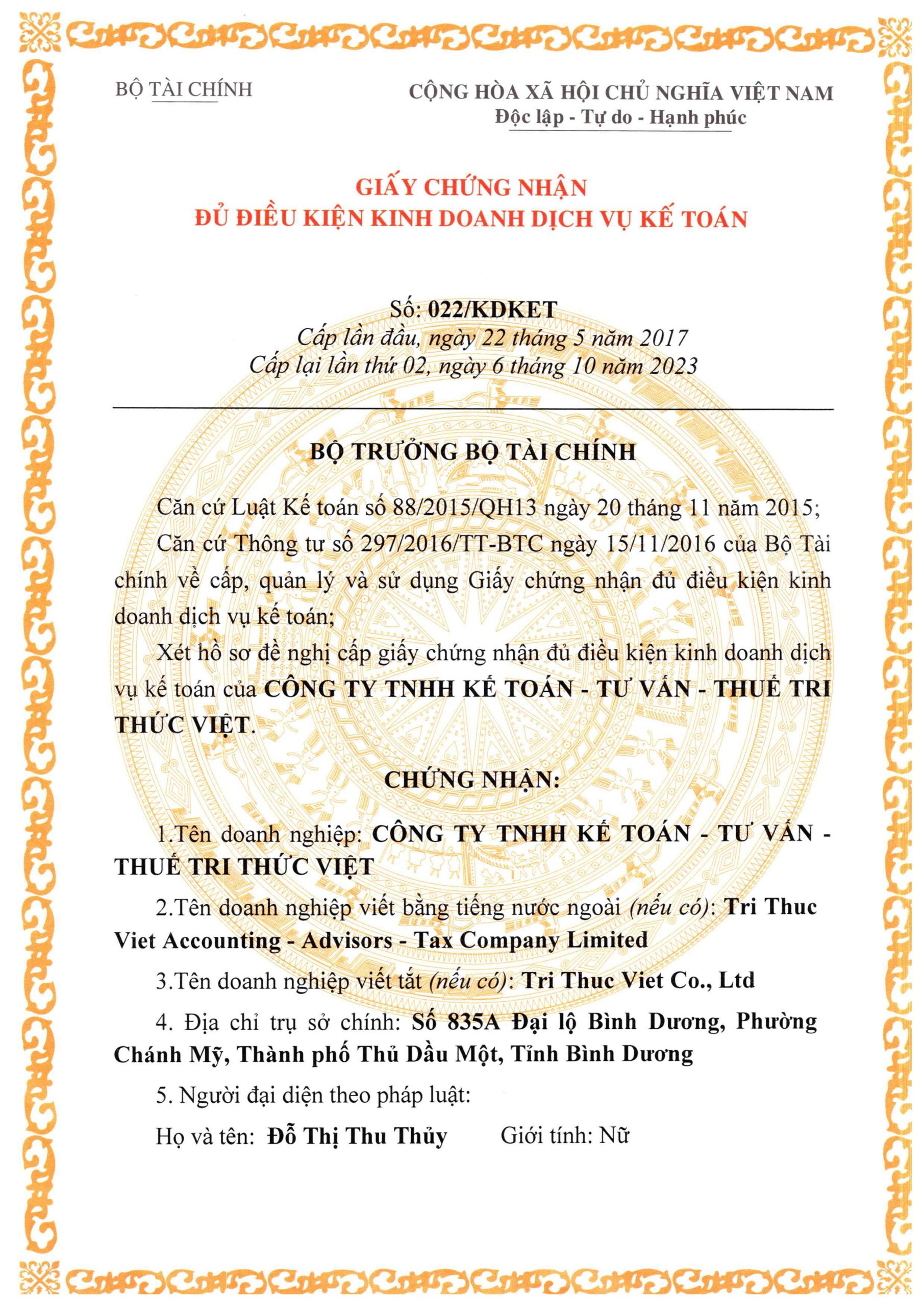 Giấy chứng nhận đăng ký kinh doanh dich vụ Kế toán: