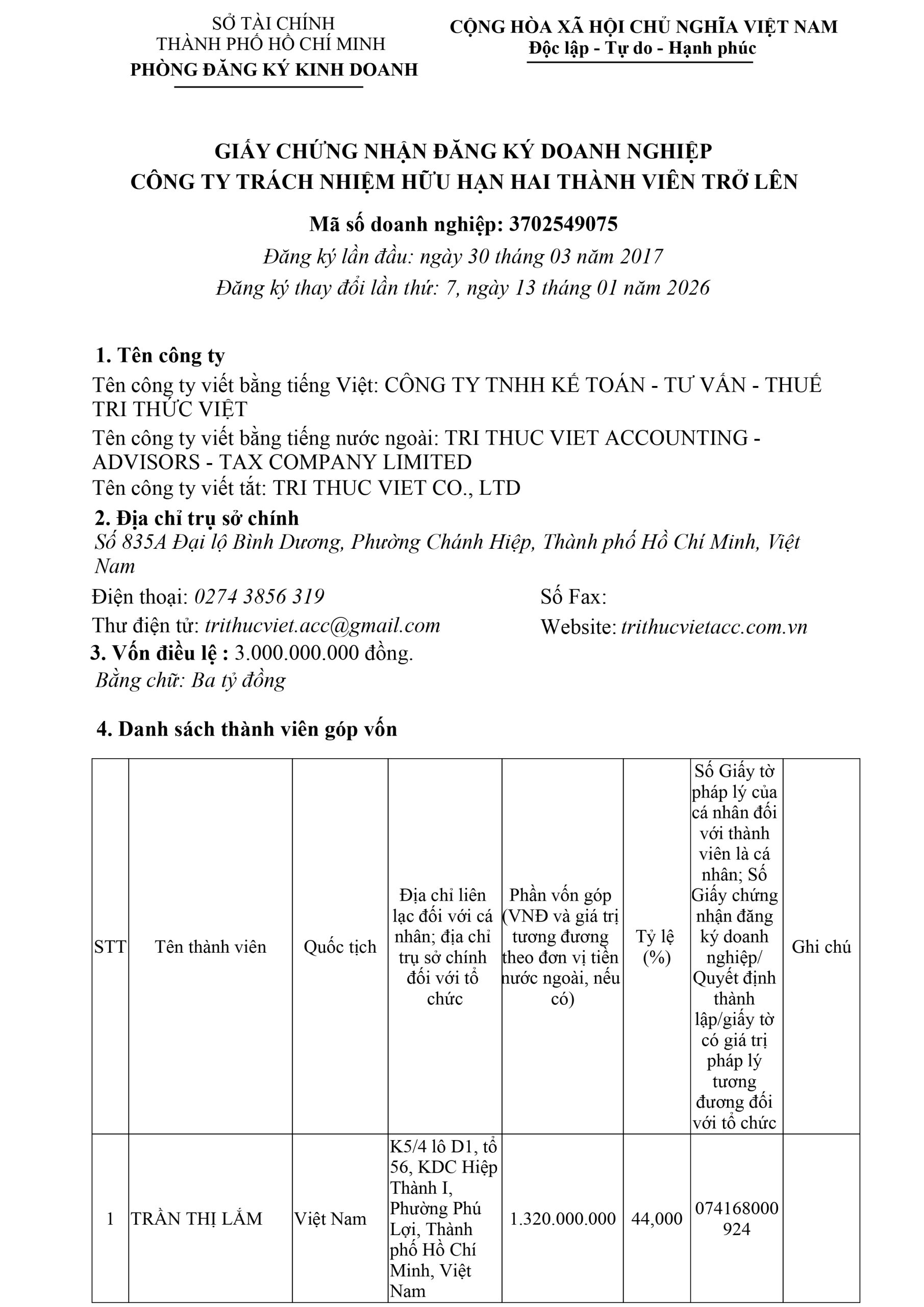 | Bà Trần Thị Lắm Chủ tịch Hội đồng thành viên Phone: 0903 930916 Emai: lamtt@trithucviet.com.vn |